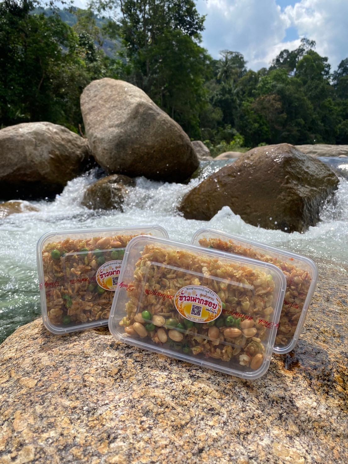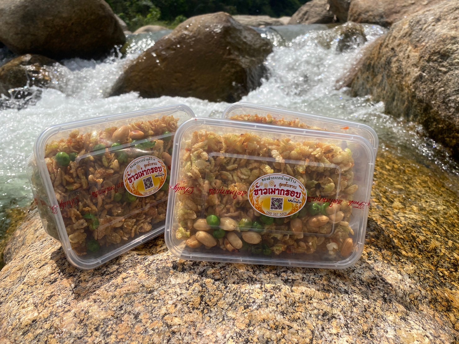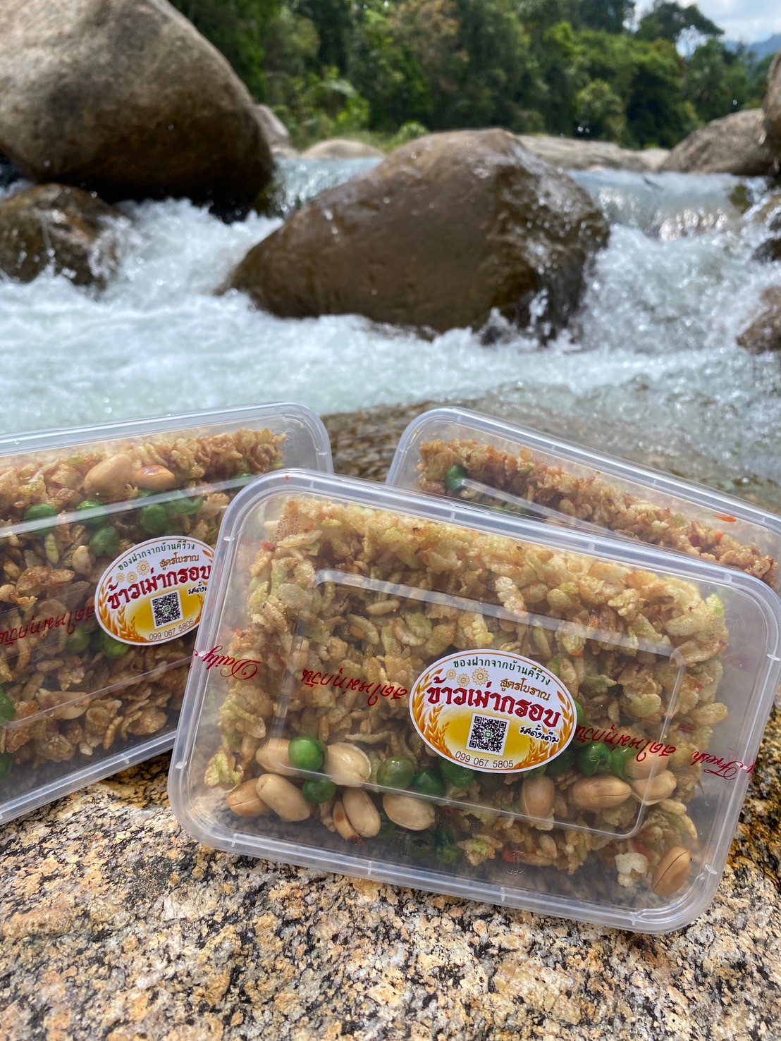 ข้าวเม่ากรอบ ทรงเครื่อง มีส่วนผสมของกุ้งแห้ง กระเทียม คลุกเคล้ากับข้าวเม่า รสชาติกลมกล่อม ไม่หวานมาก หอมกระเทียม เป็นขนมทานเล่นเพลินๆ